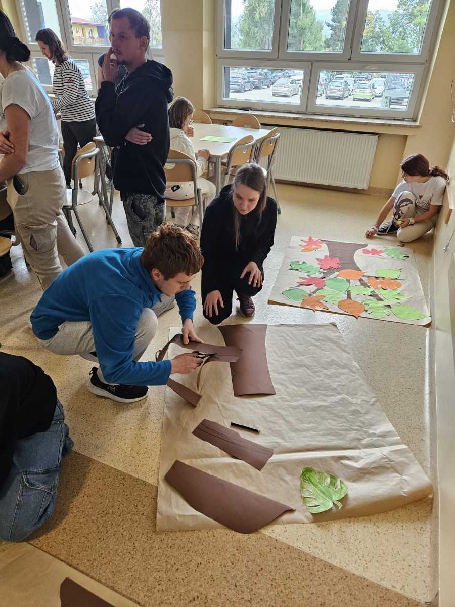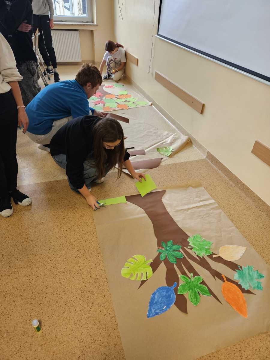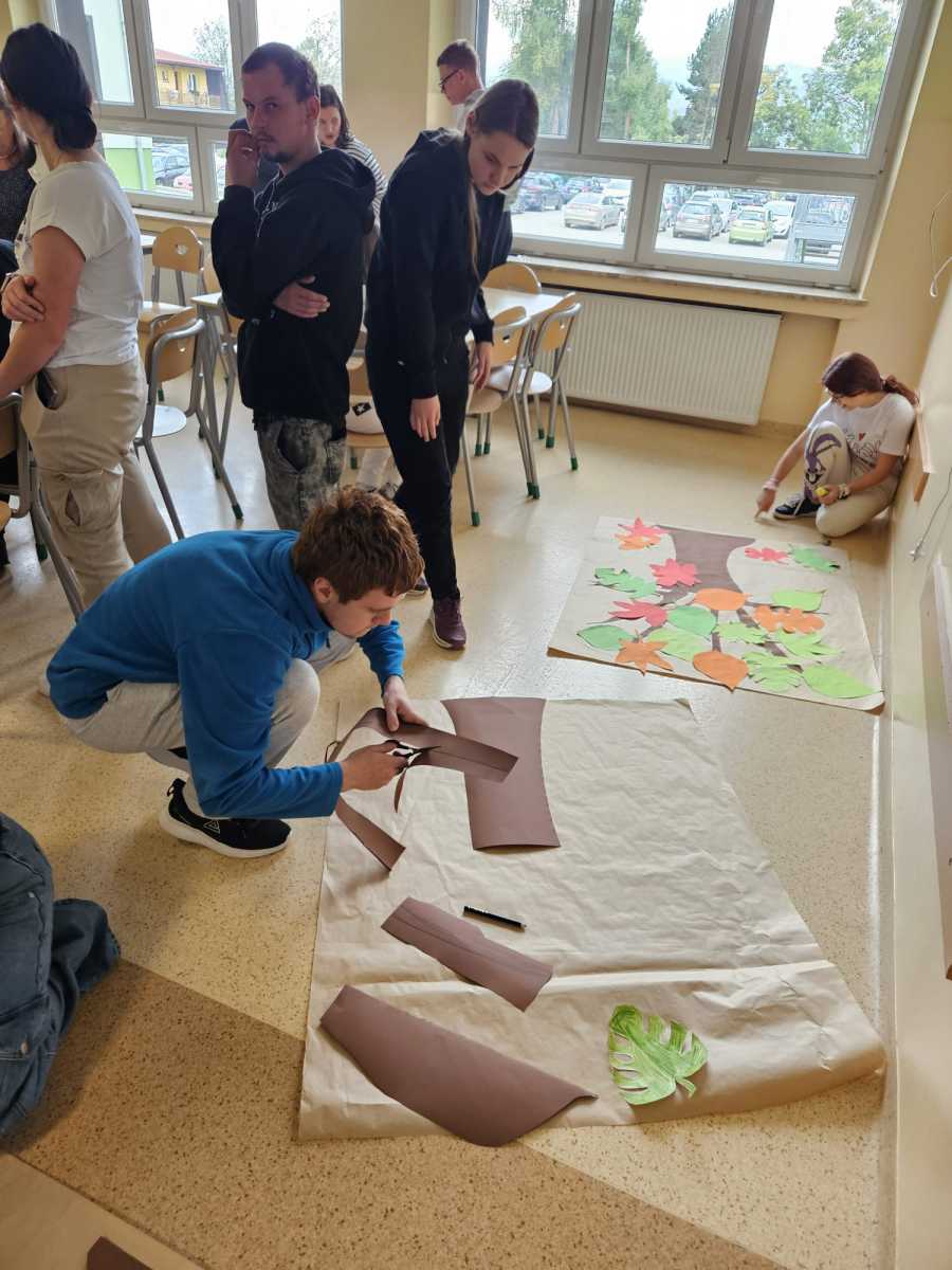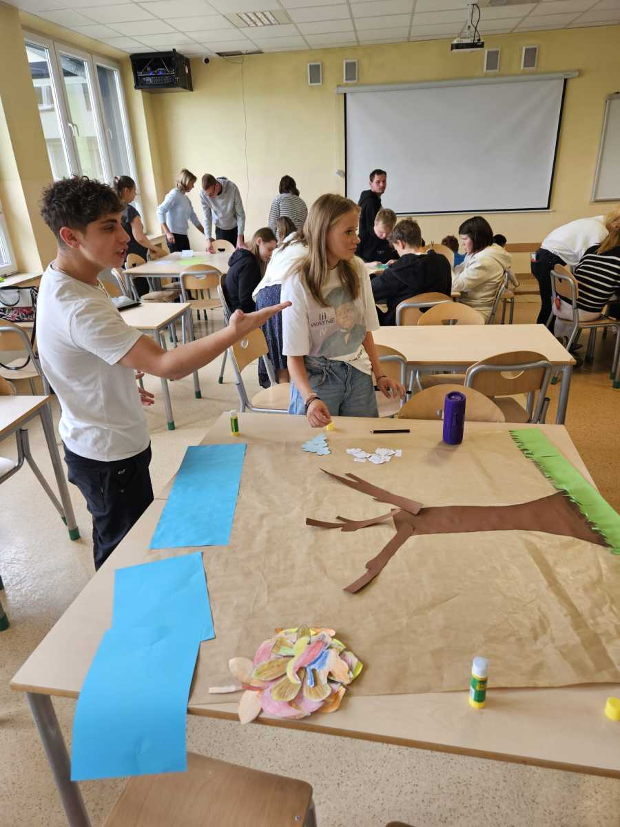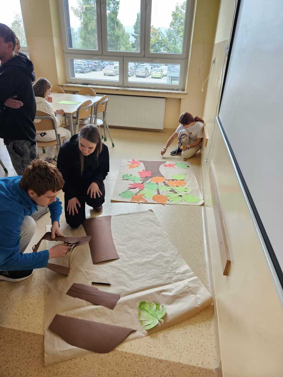 Jednym z zadań było wykonanie jesiennych drzew z hasłami o przeciwdziałaniu przemocy, które młodzież wybierała spośród dobrych i złych słów.