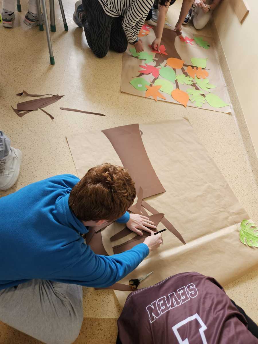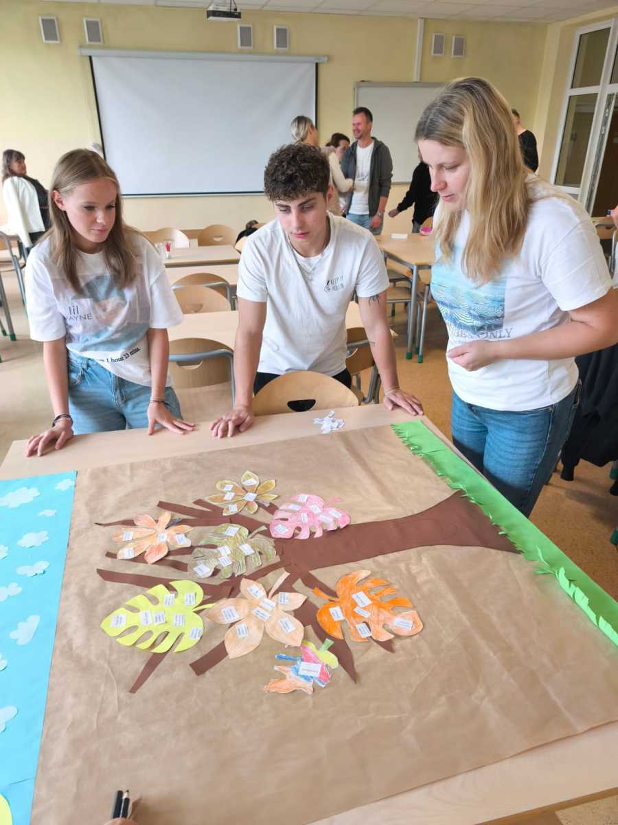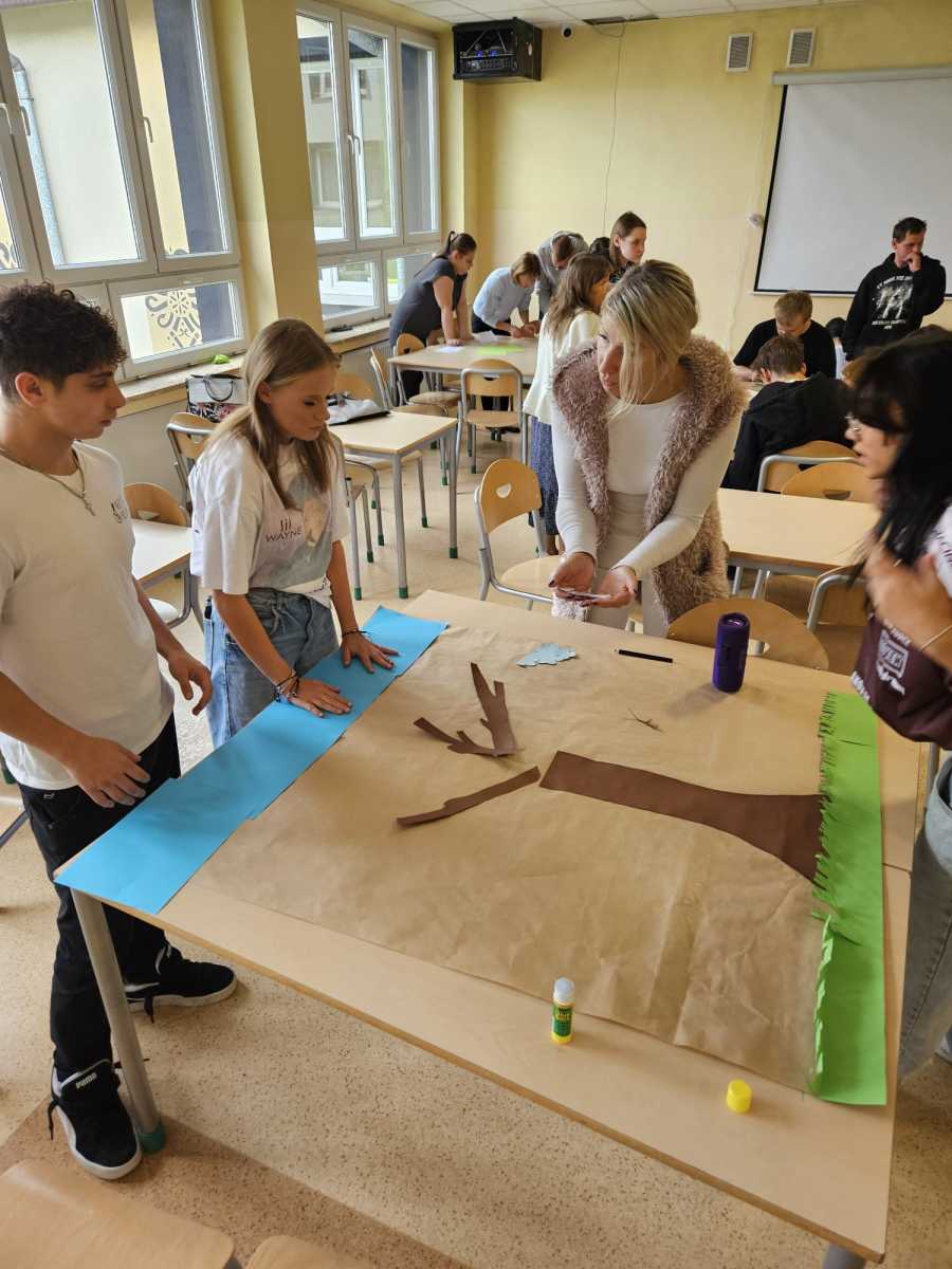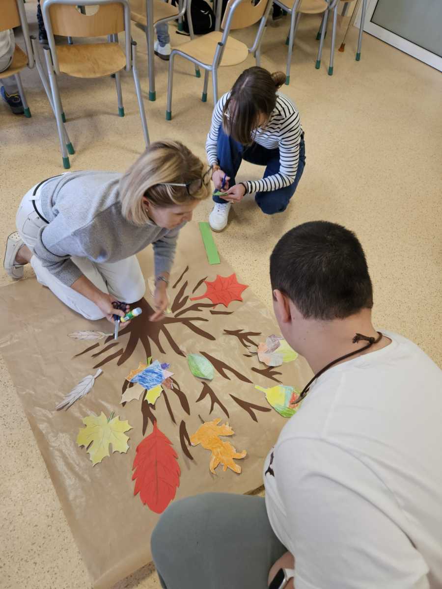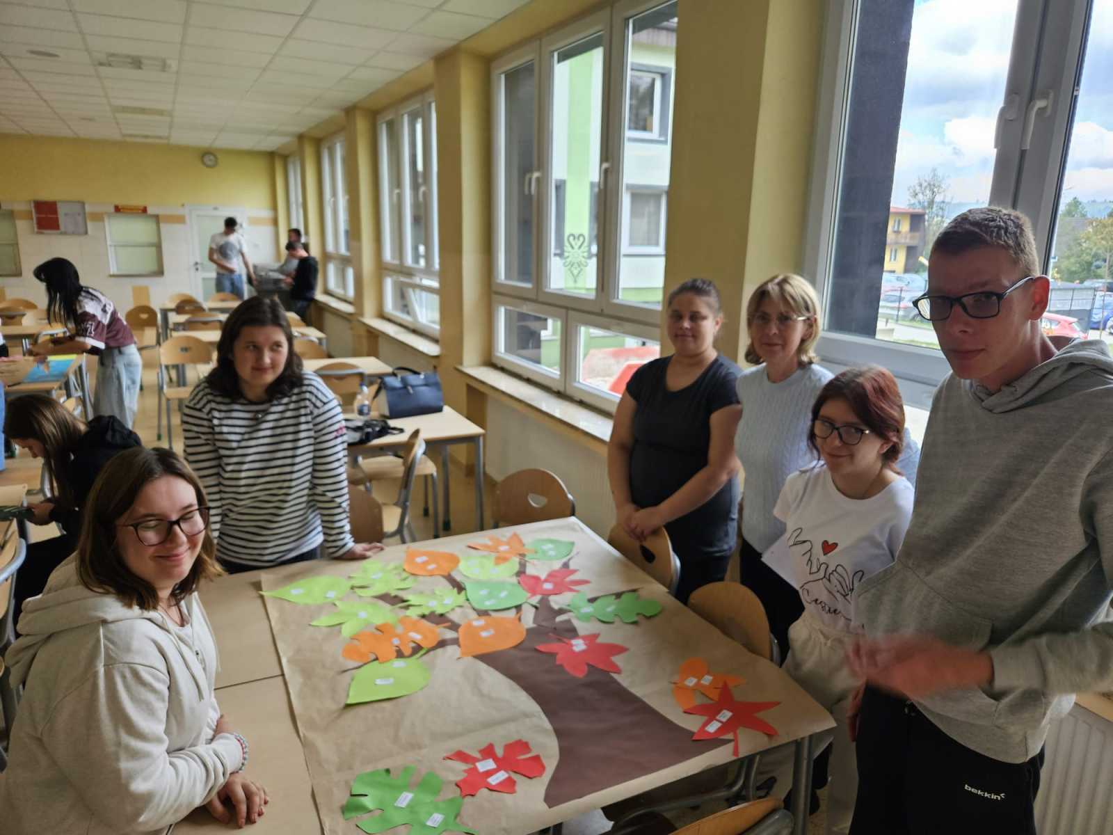 Jednym z zadań było wykonanie jesiennych drzew z hasłami o przeciwdziałaniu przemocy, które młodzież wybierała spośród dobrych i złych słów.