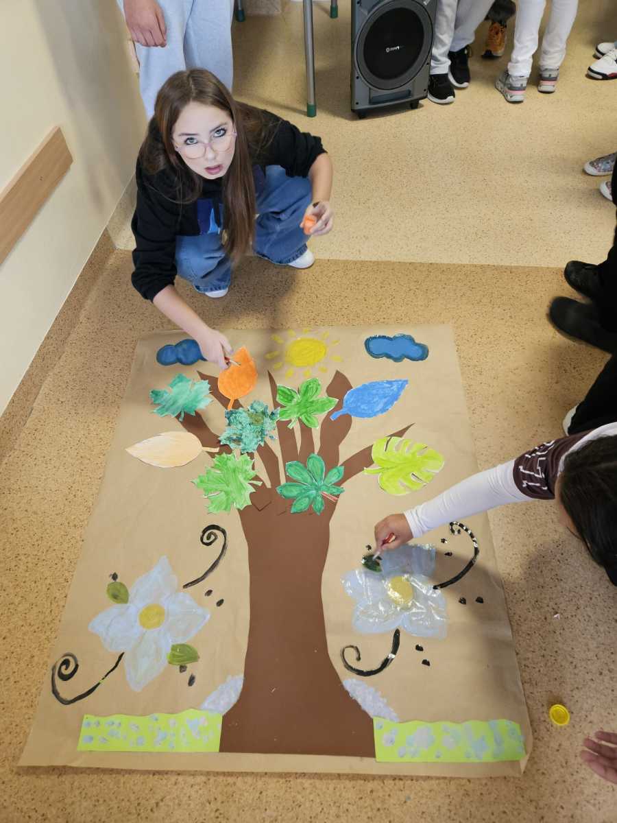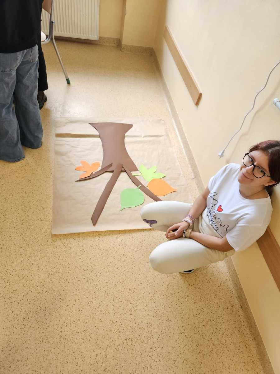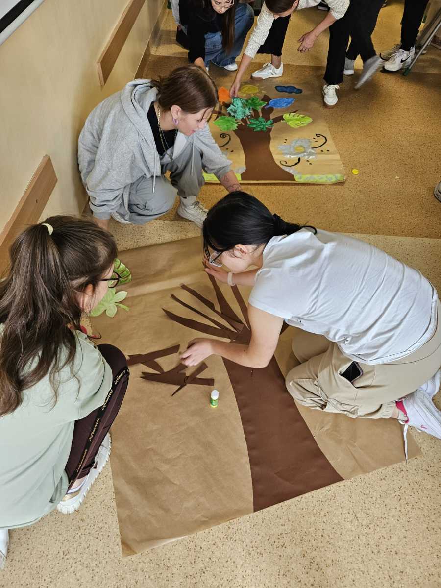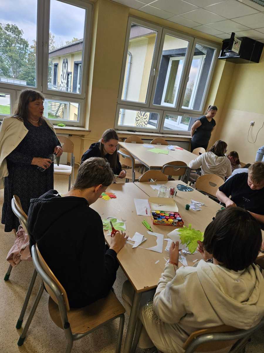 Jednym z zadań było wykonanie jesiennych drzew z hasłami o przeciwdziałaniu przemocy, które młodzież wybierała spośród dobrych i złych słów.