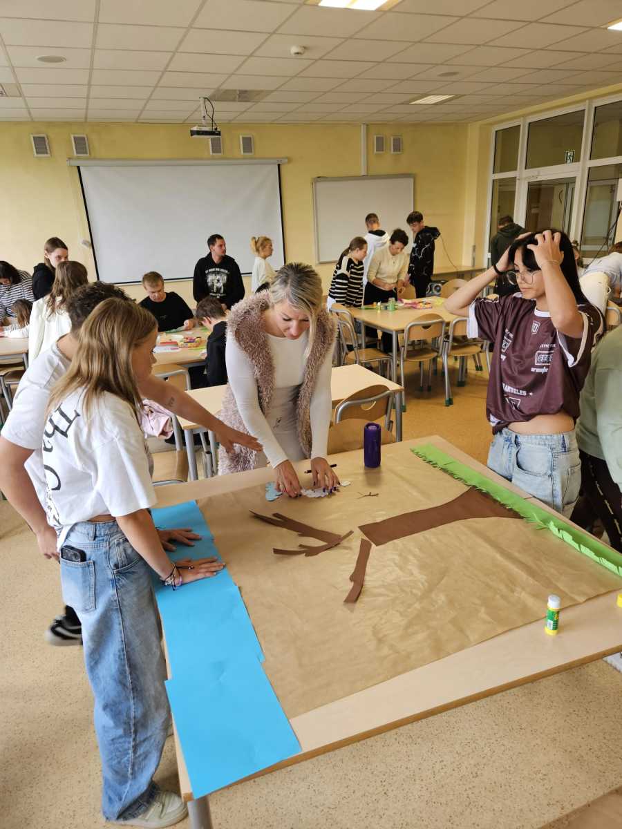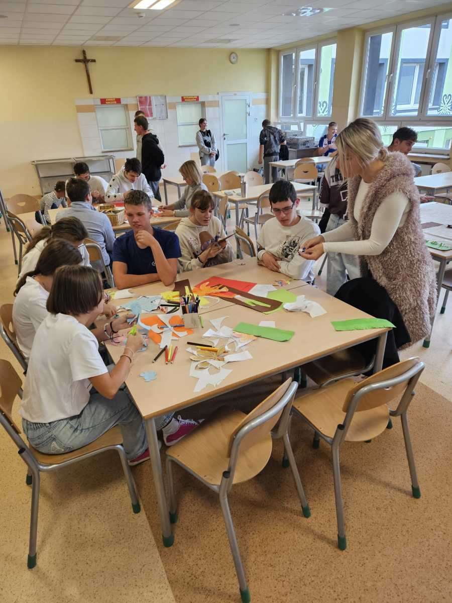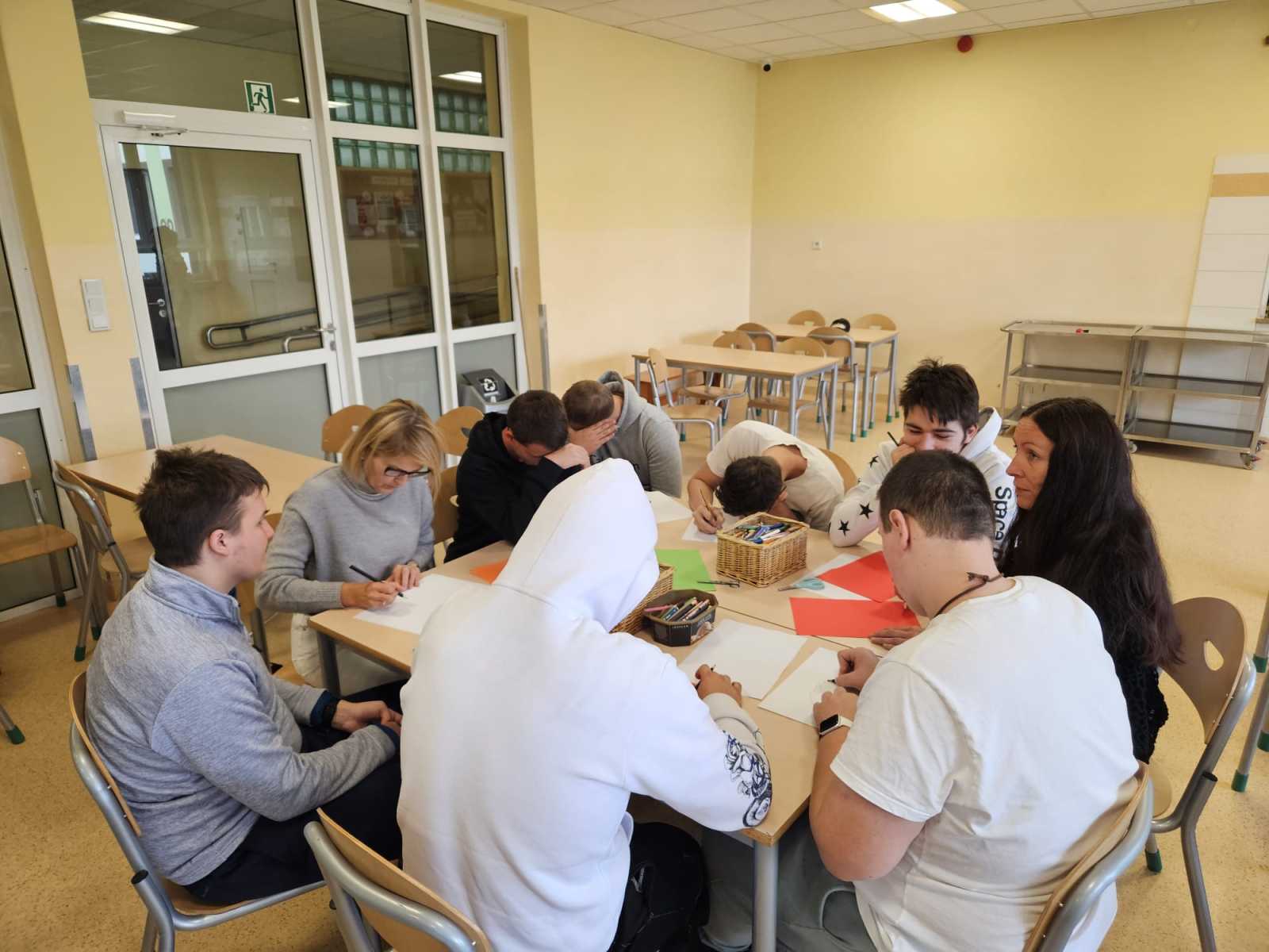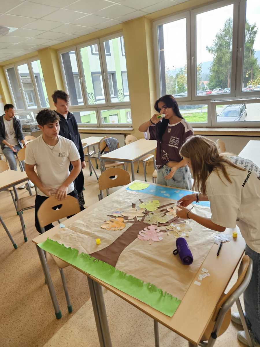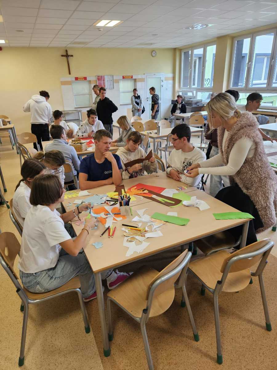 Jednym z zadań było wykonanie jesiennych drzew z hasłami o przeciwdziałaniu przemocy, które młodzież wybierała spośród dobrych i złych słów.
