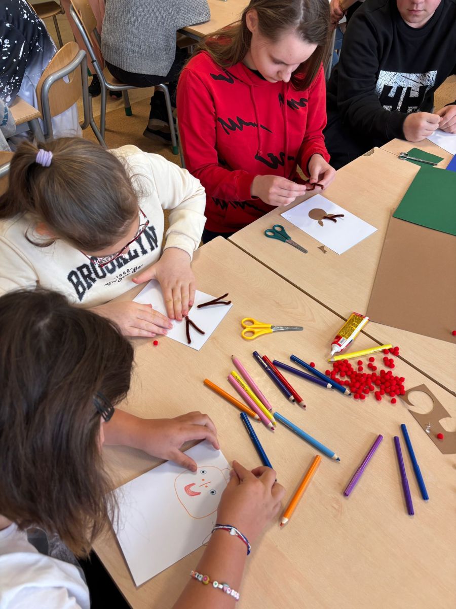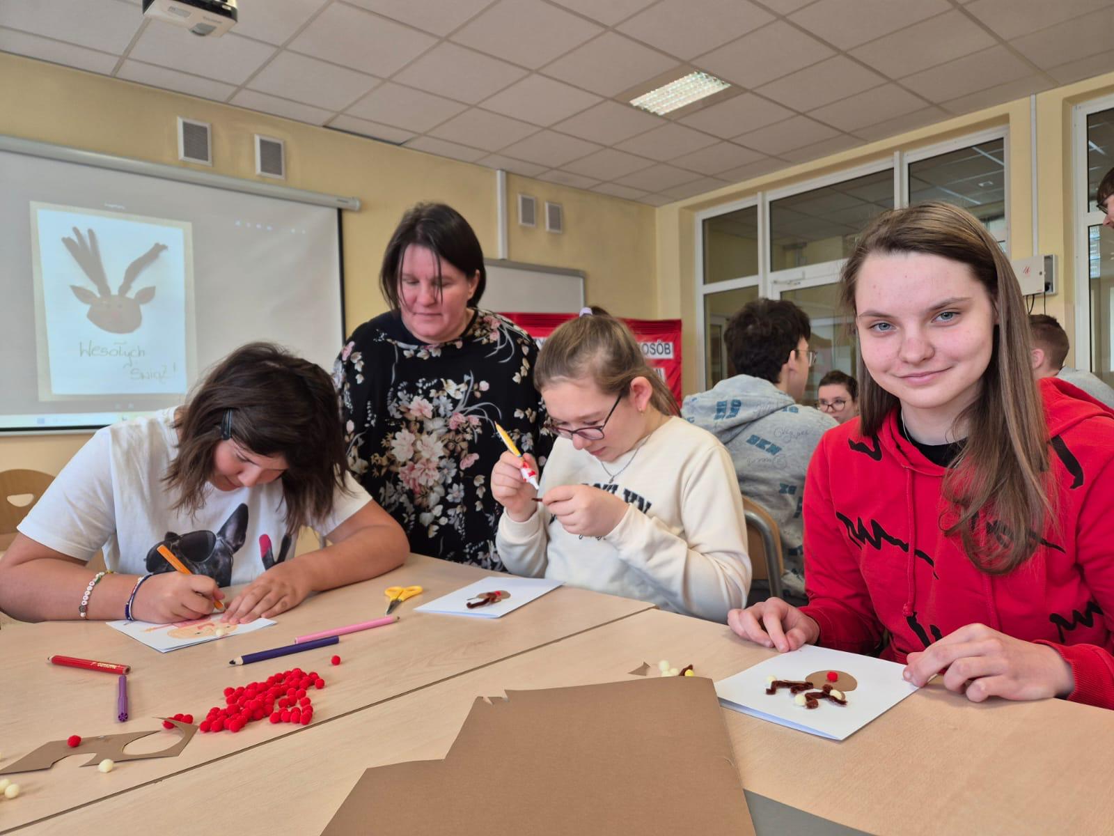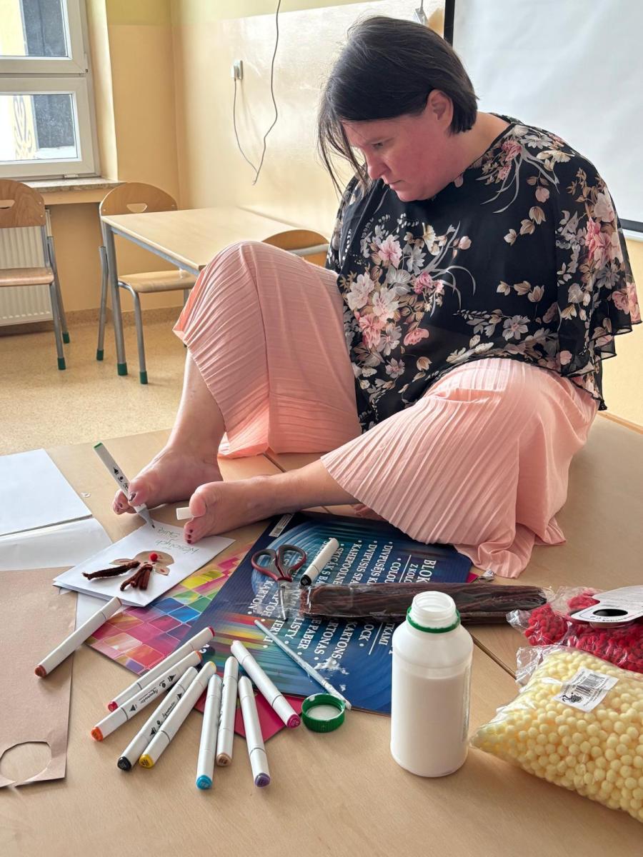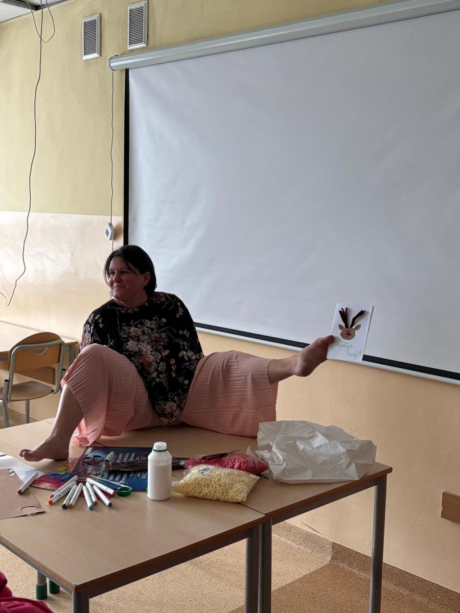Młodzież słuchała z dużym zainteresowaniem i chętnie dopytywała o różne aspekty jej życia. Spotkanie pokazało, ile siły i poczucia humoru kryje w sobie nasza bohaterka.Po części rozmowy przyszedł czas na wspólne działanie. Uczniowie razem z panią Anią przygotowali świąteczne kartki dla osób potrzebujących. Warsztaty przebiegały w spokojnej atmosferze, a każdy starał się włożyć w swoją pracę odrobinę serca.Dzisiejsze zajęcia były nie tylko lekcją o niepełnosprawności, lecz także o otwartości, wzajemnym wsparciu i tym, jak różne doświadczenia potrafią inspirować. To spotkanie na długo pozostanie w pamięci naszej szkolnej społeczności.