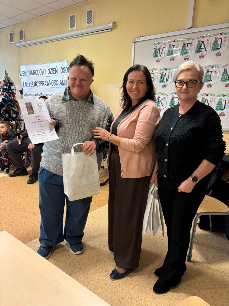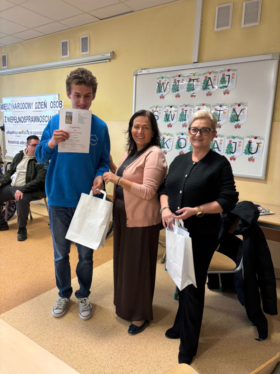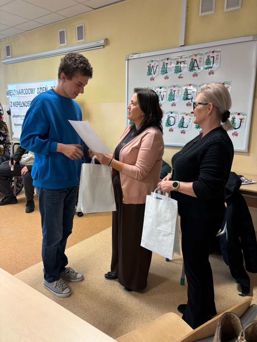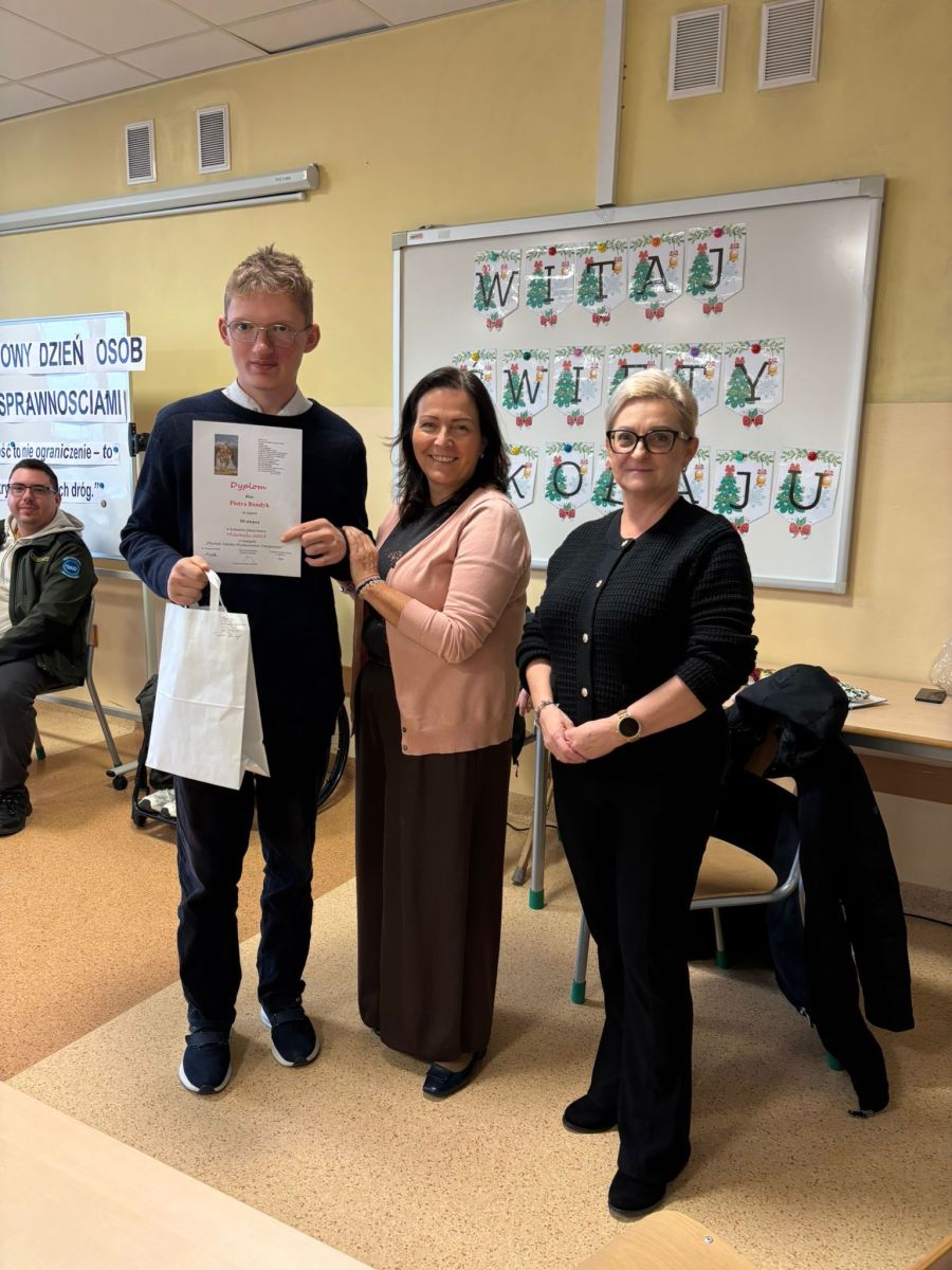 Korzystając ze wspólnego spotkania oraz obecności p. Wicedyrektor A. Trybuły, zostały wręczone nagrody uczniom, którzy wzięli udział w Konkursie Plastycznym „Mikołajki 2025”. Nagrodzeni w tym konkursie zostali: