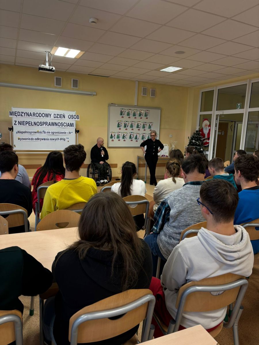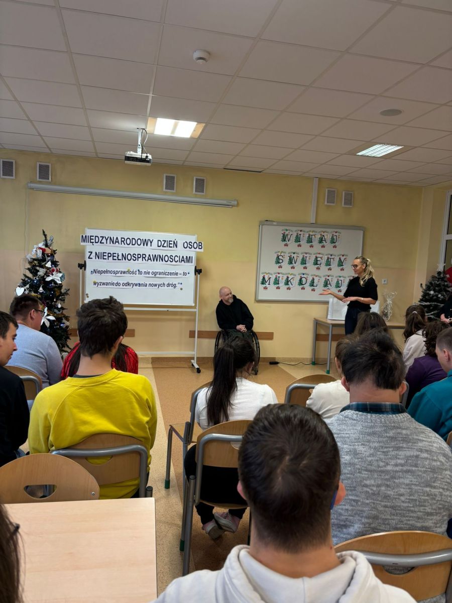 Międzynarodowego Dnia Osób z Niepełnosprawnościami. Nasi goście opowiedzieli o ich pracy, zainteresowaniach, życiu codziennym. Mimo swych niepełnosprawności, udowadniają, że mogą spełniać swoje marzenia, realizować plany. Uczniowie naszej szkoły byli żywo zainteresowani wypowiedziami uczestników ZAZ, ponieważ w przyszłości również oni mogliby znaleźć tam zatrudnienie i spełniać się zawodowo.
