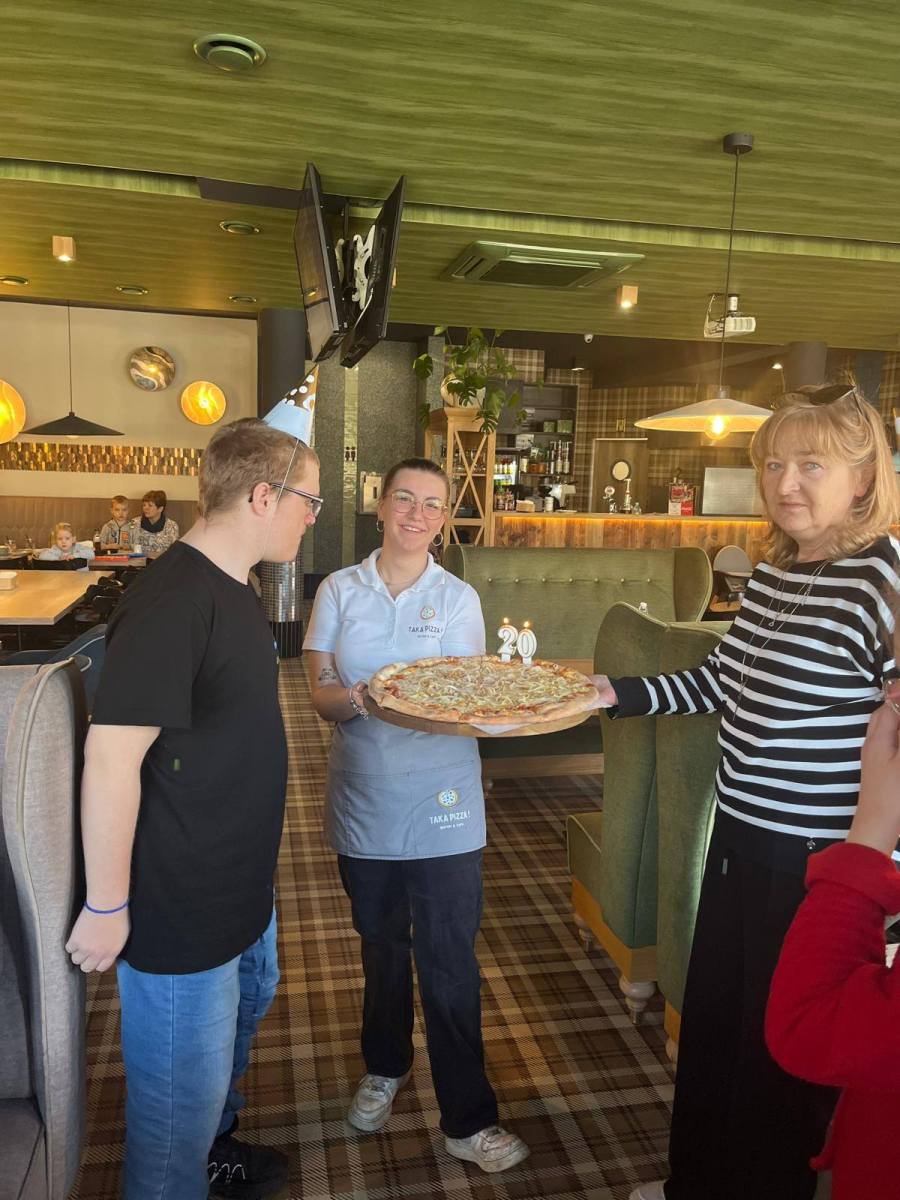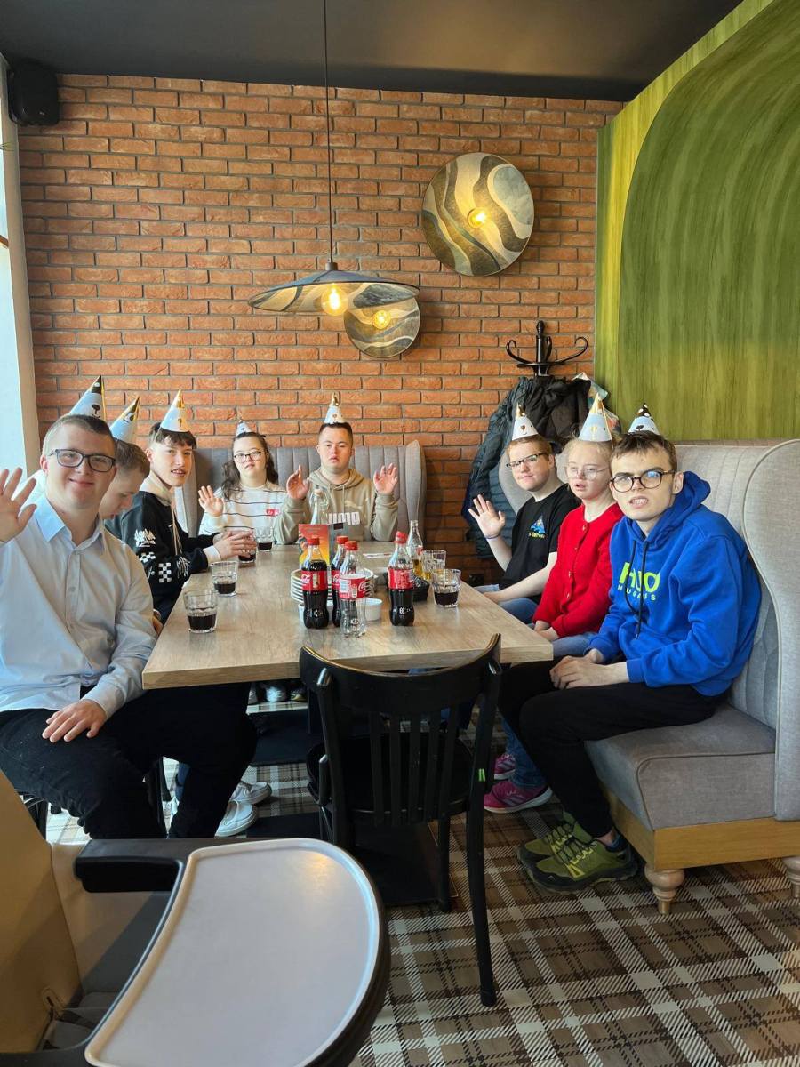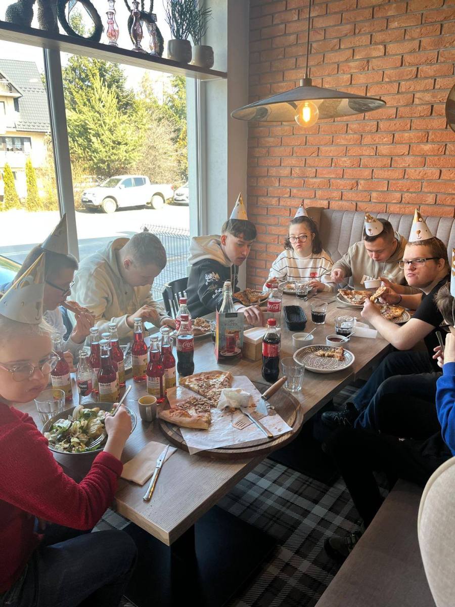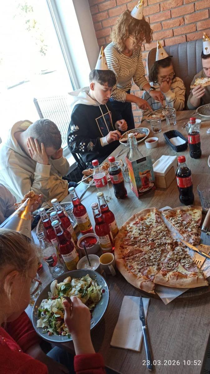 Nasz kolega, Krystian, obchodził niedawno swoje dwudzieste urodziny. Celebrowaliśmy je może trochę nietypowo, bo w pizzerii ,,Taka pizza” – ale bardzo nam się taki sposób świętowania urodzin podobał. Było dmuchanie świeczek na pizzy, życzenia, była degustacja ,,do rozpuku”, były rozmowy, radość i wspólnie spędzony czas. Dziękujemy mamie Krystiana za pomoc w sfinansowaniu naszej imprezy: oet 8b i 8c.
