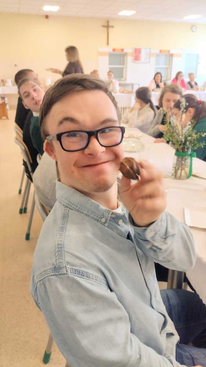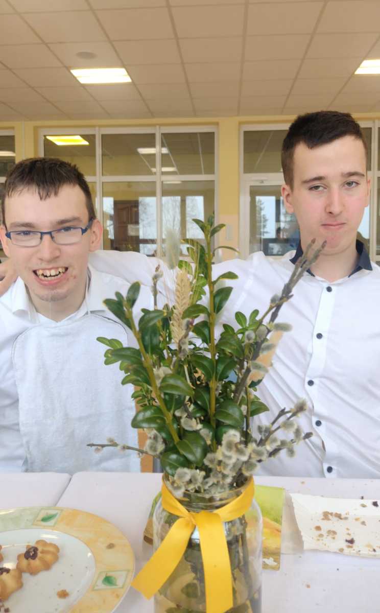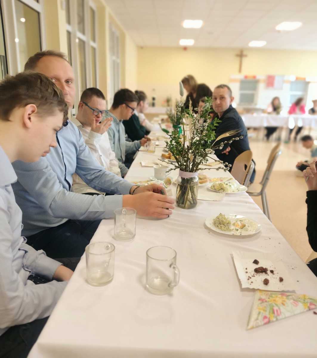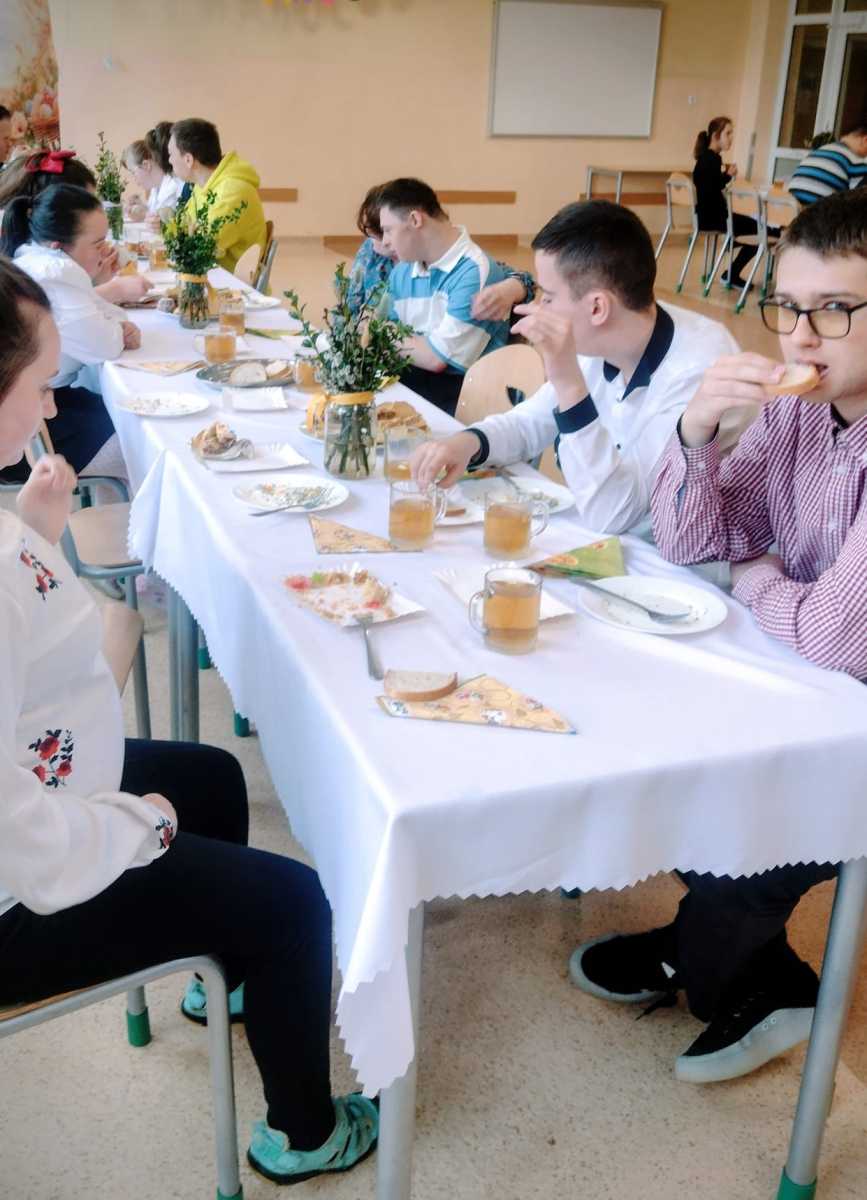 Dnia 27 marca cała społeczność Szkoły Przysposabiającej do Pracy wraz z Dyrekcją i nauczycielami spotkała się na wspólnym śniadaniu wielkanocnym. Po świątecznych życzeniach, zasiedliśmy do stołów. Było pysznie i bardzo rodzinnie – na stołach królowała sałatka śledziowa, jajka z sosem chrzanowym i szczypiorkiem przygotowane przez naszych uczniów na zajęciach kulinarnych oraz mnóstwo wspaniałych ciast, a do tego pyszna kawa. Za te słodkie pyszności z całego serca dziękujemy Rodzicom naszych uczniów.